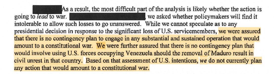 In this context, it’s worth examining the December 23, 2025 memo issued by the U.S. Department of Justice’s Office of Legal Counsel advising President Trump on the planned use of the U.S. military to seize Maduro. In that 22-page memo, Assistant Attorney General Elliot Glaser says his advice is based on a key condition: no plans for a prolonged U.S. military presence.