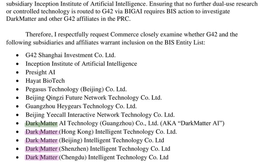 One of those companies the House Select Committee urged the BIS to place on its entity list as G42 affiliate, Dark Matter AI Technology ( Guangzhou) Co. , Ltd (暗物智能科技(广州)有限公司), appears to be still active, according to official Chinese records. The firm has garnered more than $60 million in investment from Chinese state-owned companies, and is viewed as strategically important to China’s AI development, according to the Select Committee.
